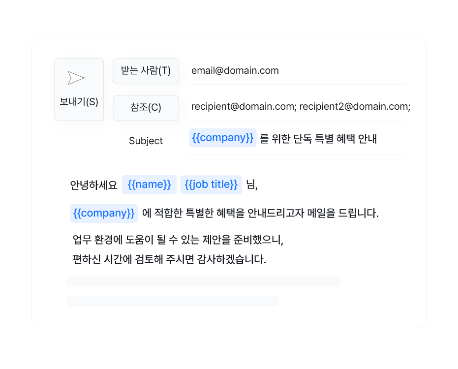 수신자 별 이름·회사·내용을 자동으로 반영해개인화 된 메일을 개별 발송할 수 있습니다.